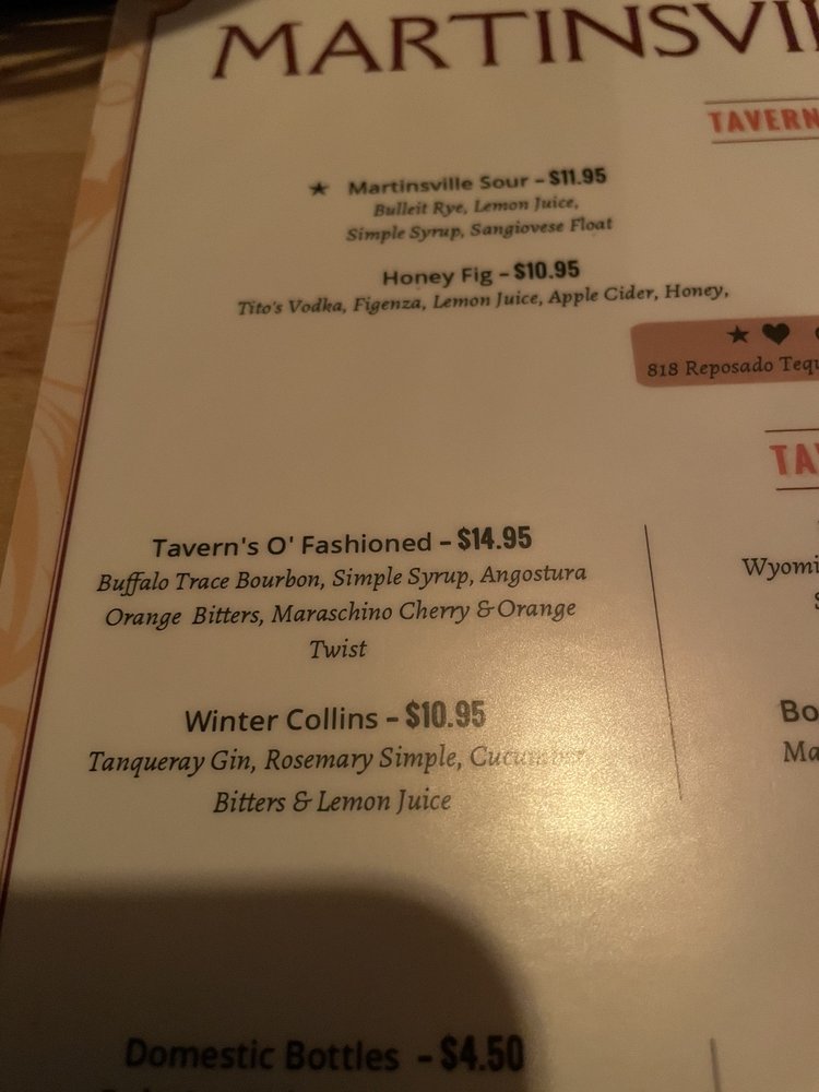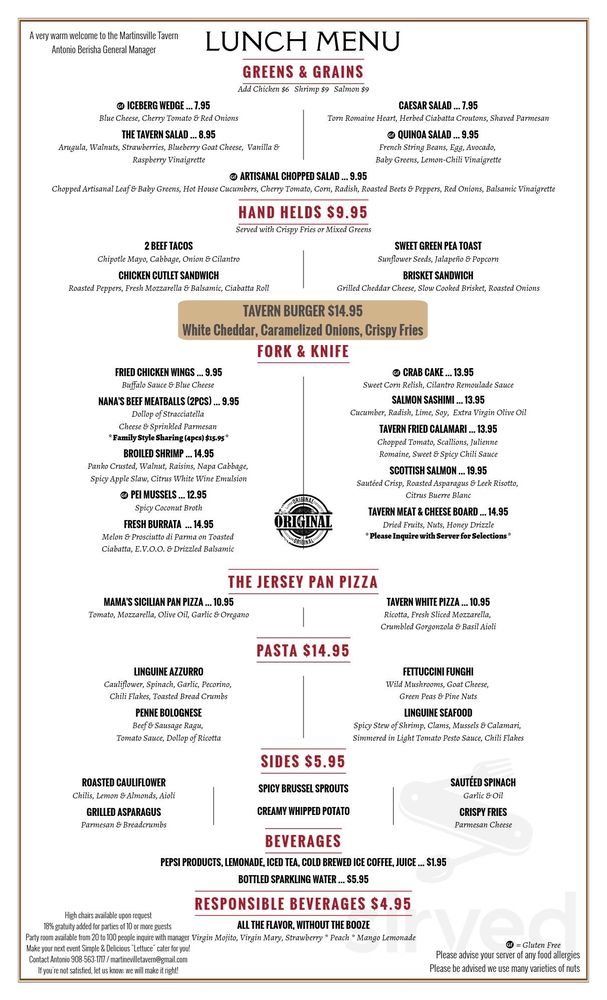 Martinsville Tavern, located in Martinsville, NJ, offers a diverse menu of American cuisine in a warm and inviting setting. With a range of dinner starters like Beef Meatballs and Crab Cake, along with fresh Greens and Grains options such as Classic Caesar salad and Greek Chopped Salad, the menu caters to various preferences. The Dinner Pasta choices like Linguine Azzurro and Penne Bolognese showcase the chef's expertise in creating flavorful pasta dishes. Customers have raved about the sauteed broccoli rabe, fire-roasted branzino, and indulgent desserts like the s'mores brownie. The cozy ambiance, attentive service, and impressive selection of dishes make Martinsville Tavern a must-visit spot for a memorable dining experience. Their commitment to quality and diverse offerings make it a popular choice for both casual gatherings and special occasions.